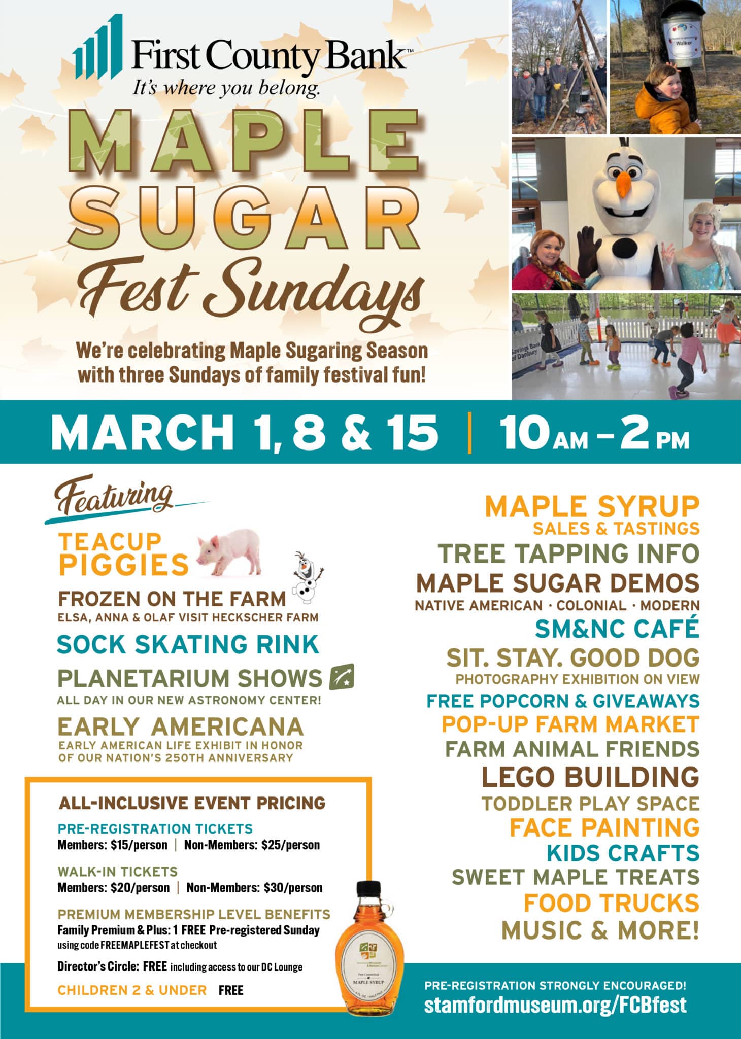 Join us for our annual First County Bank Maple Sugar Fest Sundays! There will be tons of festival fun as we make our very own line of maple syrup from the 200+ mature maple trees found right here on our 118-acre campus. We’re one of only two official maple sugar producers in Fairfield County!