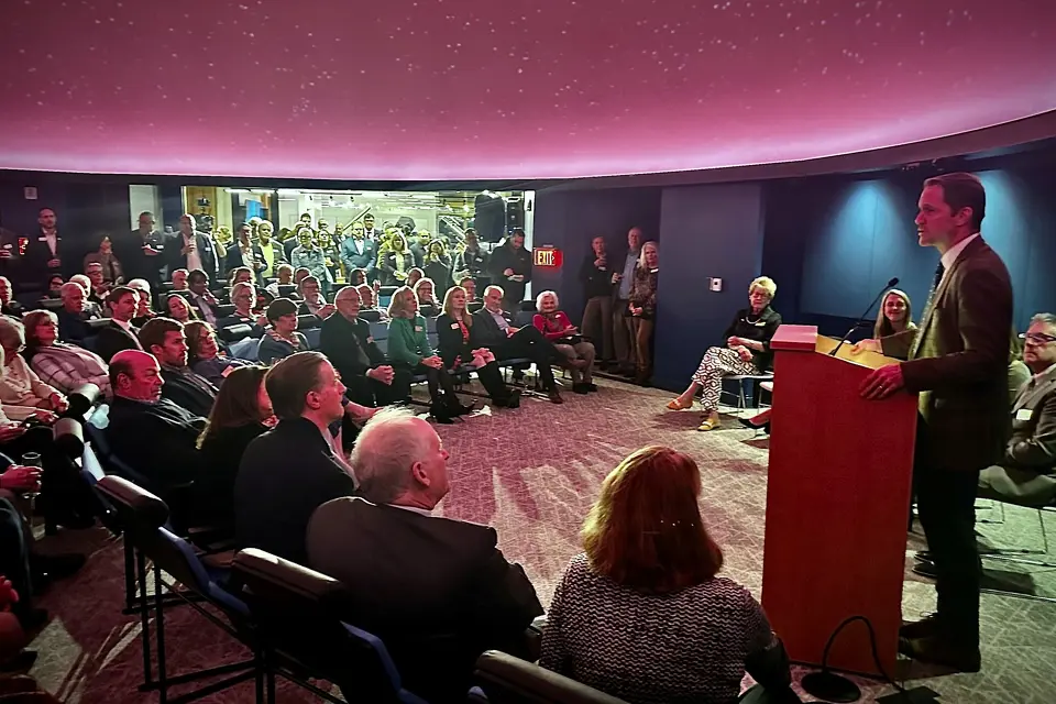 A charming theme of the evening is the universal appreciation of Mulrooney’s resolve to see this project realized after 20 years in the captain’s chair. The results left her “gobsmacked.” In retracing her map to the stars, she recalls sharing plans for the Astronomy Center with Himes when he first took office 16 years ago.